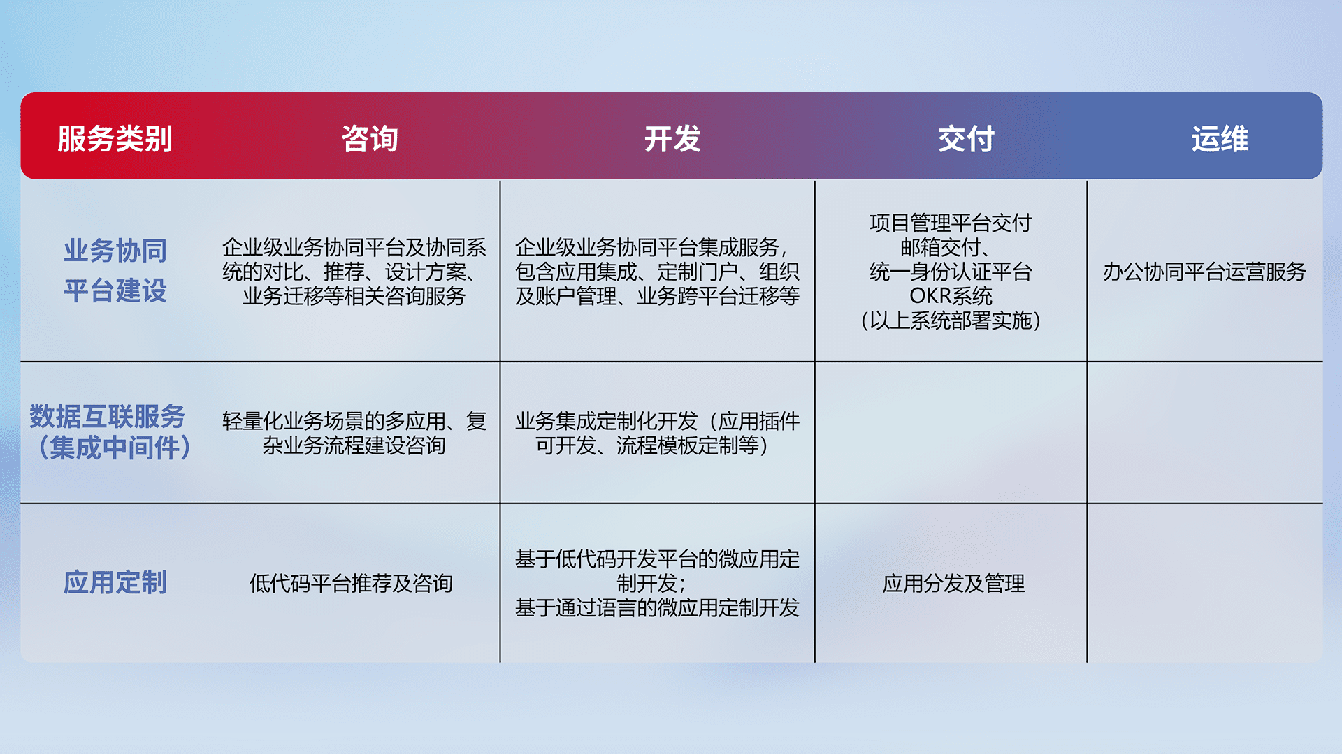 针对钉钉、、企微、、、IDaas等平台级产品提供产品的规划、、、、方案、、、交付、、、定制化开发等服务,,,实现如统一协同办公、、、、智能客户服务、、、混合会议管理、、智能数据查询、、、等业务场景,,实现数字化转型。。。